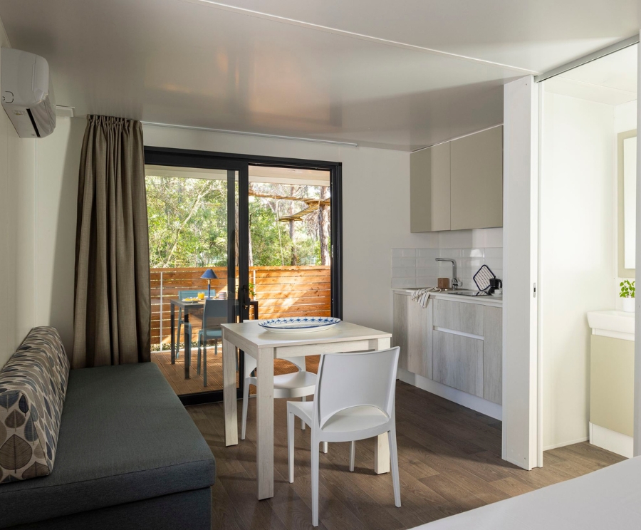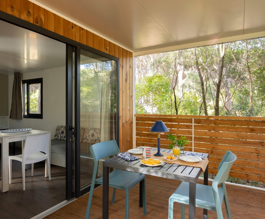 The furnished veranda with table and chairs becomes your personal space in the pine forest: slow breakfasts, sunset aperitifs and relaxing moments surrounded by greenery.