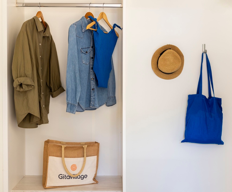 Un letto matrimoniale e un armadio a vista: uno spazio pensato per garantire funzionalità, riposo e tranquillità dopo una giornata attiva.