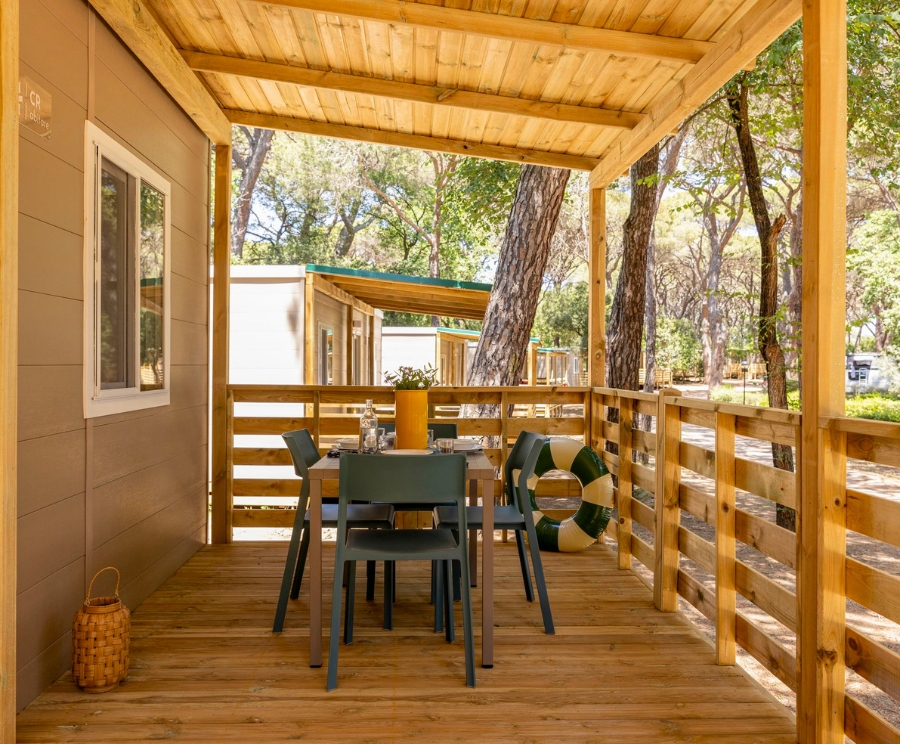 Con tavolo e sedie, è lo spazio perfetto per colazioni veloci, momenti di pausa o serate all’aperto sotto la pineta maremmana.