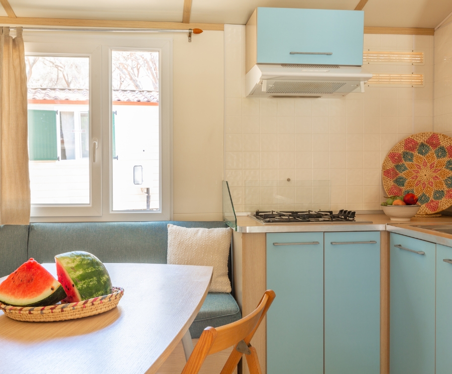 Il soggiorno con cucina attrezzata diventa il cuore della lodge: piano cottura a gas, frigorifero, stoviglie e pentole ti permettono di organizzare i pasti in autonomia, vivendo la vacanza con la libertà di una casa immersa nella pineta maremmana.