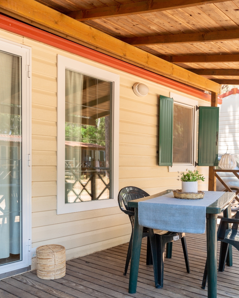 All’esterno, la veranda coperta con tavolo e sedie è lo spazio perfetto per colazioni tranquille, pranzi all’aria aperta o serate sotto i pini, per vivere appieno la dimensione naturale del villaggio.