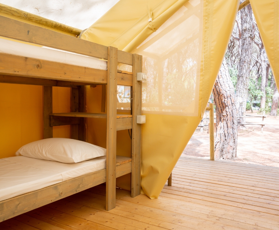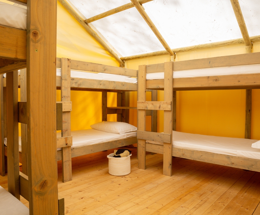 La Tenda Safari offre un unico grande ambiente in stile glamping, organizzato per farti vivere il campeggio in modo semplice ma funzionale. Uno spazio arioso, luminoso e interamente in legno, per condividere la vacanza.